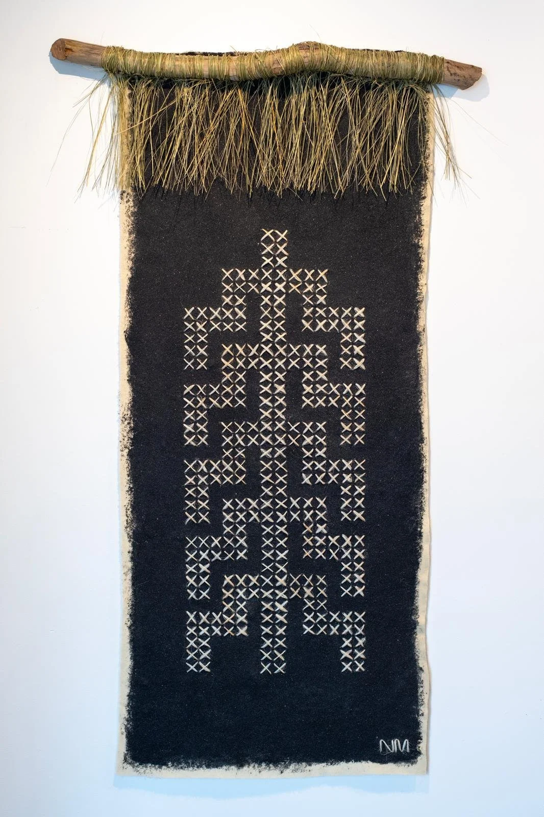 The central piece, Poutama o Ōruarahi, was woven from muka and layered with black sand (onepū rino) gathered from directly below our marae. The stepped poutama pattern — inspired by the tukutuku panels of Ōruarahi Marae — symbolises growth, learning, and ascent. Working on a larger scale, the process felt like a dialogue between fibre and tide, between the histories held in sand and the stories rising through the pattern.